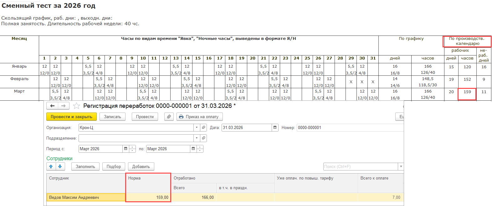 Расчет нормы в документе Регистрация переработок для оперативного графика