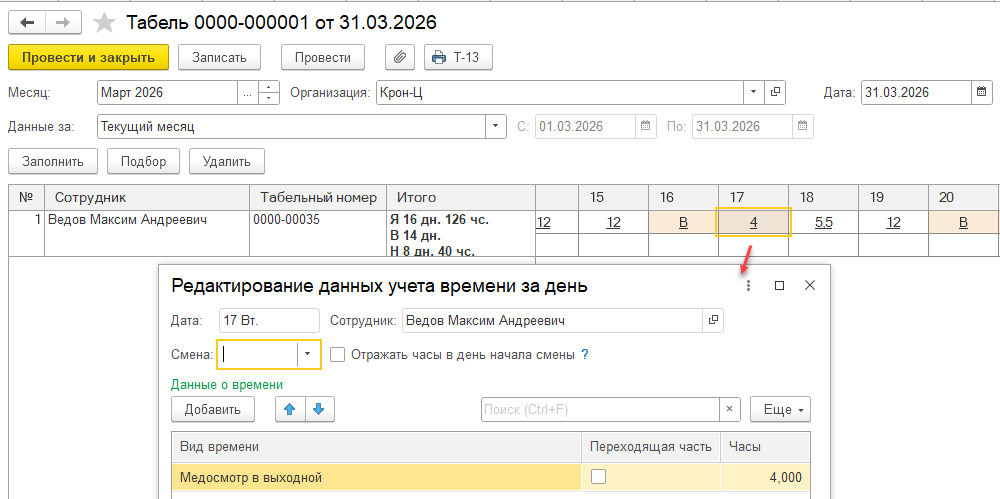 Создан табель, где этот день изменен на медосмотр 4 часа.