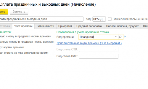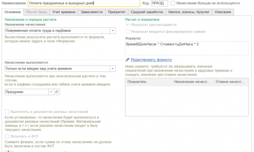 Чтобы поменять начисление, лучше не редактировать действующее сейчас начисление «Оплата работы в праздничные и выходные дни», а создать еще одно копированием имеющегося. Новое начисление назвать немного по-другому, а в старом — проставить флажок Начисление больше не используется (вверху рядом с полем Код). Это позволит сохранить историю работы с начислениями.
