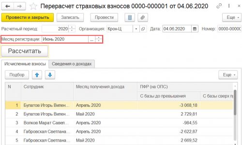 То, в «Отражение зп» за какой месяц попадет перерасчет взносов, зависит от Месяца регистрации документа