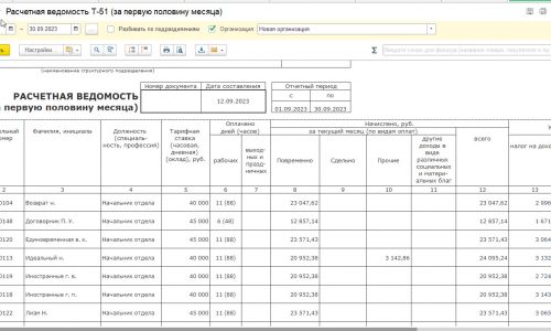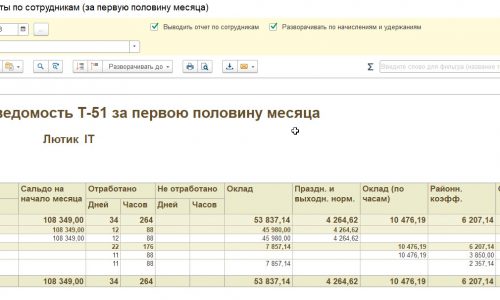 2. Добрый день. Банку нужна форма Т51 за 1 половину месяца. При формировании расчётной ведомости за первую половину не встают начисления и отработанные дни, только выплата. Можно, конечно, копировать из отчета и вставлять в т51, только в т51 сотрудники идут не по алфавиту опять же. И настроек нет. А в отчете сотрудники по алфавиту.Хотелось бы какого-то облегчения…