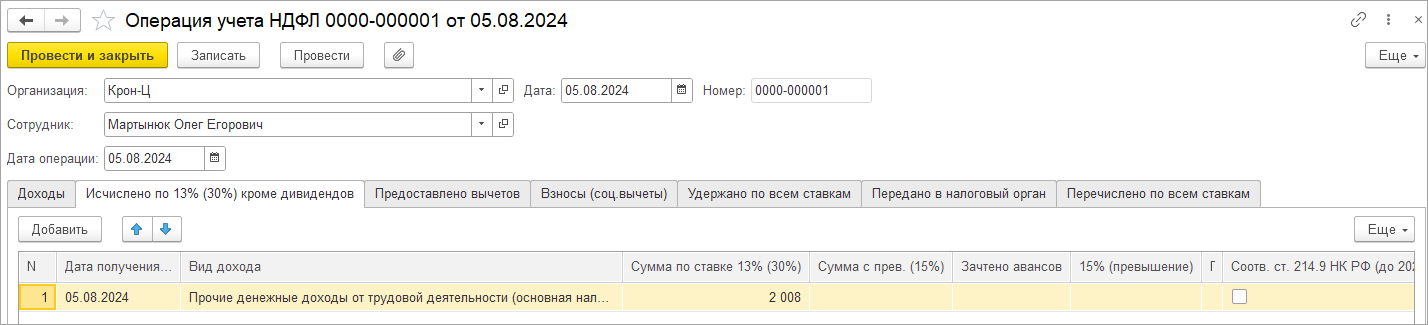 1. Нам нужно сравнять НДФЛ в НУ и БУ, чтобы потом провести перерасчет и исправить налог. Для этого создадим документ Операция учета НДФЛ и увеличим в НУ исчисленный НДФЛ на 2008 руб.(дата получения дохода 05.08.2024) . Т.к. документ Операция учета НДФЛ делает движения только в НУ у нас по сотруднику НДФЛ сравняется в НУ и БУ.