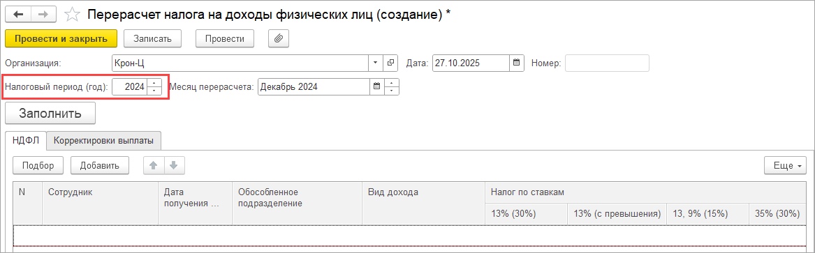 2. Теперь у нас НДФЛ завышен одинаково и в НУ и в БУ. Не боимся этого, теперь нам будет проще исправить ситуацию. Чтобы исправить исчисленный НДФЛ в НУ и БУ создадим документ Перерасчет НДФЛ за 2024 год ( можно попробовать августом 2024 или декабрем 2024). И заполним документ Перерасчет НДФЛ (или можем добавить сотрудника по кнопке Подбор) — ожидаем, что автоматически подтянется сумма НДФЛ по сотруднику с минусом -2008. Т.к. документ Перерасчет НДФЛ делает движения в регистрах в НУ и в БУ , то теперь НДФЛ должен отразится верно в НУ и БУ – уменьшится на – 2008 руб.