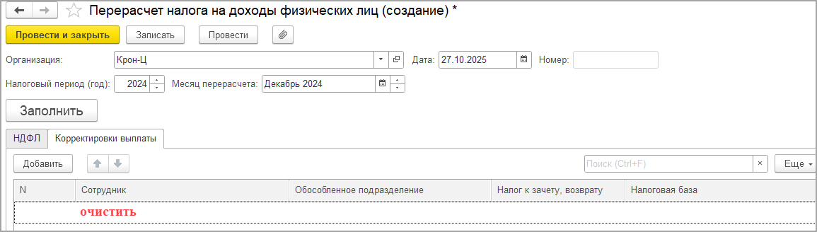 3. При этом если заполнилась корректировка выплаты — то очищаем ее (у нас в НУ в действительности нет отрицательно исчисленного НДФЛ, поэтому корректировка не нужна):