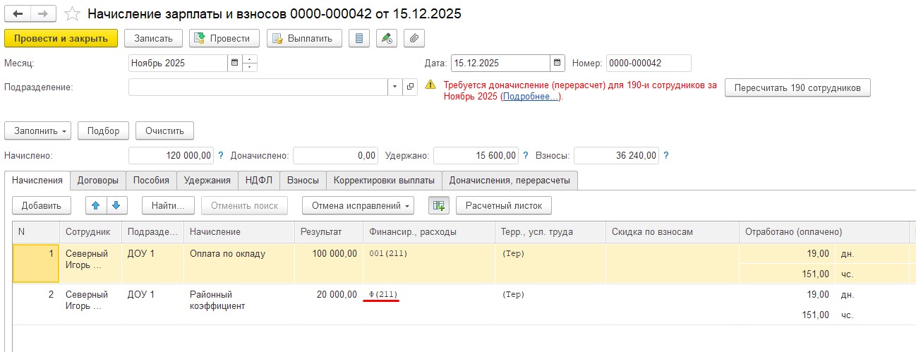 Добрый день!К сожалению, программа не предусматривает наличие нескольких Районных коэффициентов. Поэтому она корректно и не отработает такой сценарий,здесь мы можем теперь только вручную откорректировать разбивку по статьям финансирования😟 Чтобы в будущем не возникало такой проблемы можно попробовать сделать так: оставить один районный коэффициент(который родной). А по сотрудникам, которым нужно РК разбить на разные статьи финансирования вводить документ Бухучет начислений сотрудников, в нем есть возможность указывать распределение в пропорциональном соотношении, прикладываю ссылочку на статью где про это говорится Распределение бухучета в документе Бухучет начислений сотрудников (ЗУП 3.1.36.19)