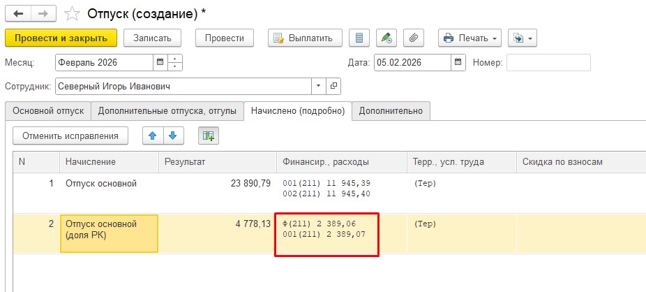 Работаем в ЗГУ, возникла проблема что при расчете основного отпуска с выделением РК и СН сумма отпуска распределяется по статьям финансирования, а доли нет. РК и СН точно начислены по разным статьям и в начислениях долей настроено, что финансирование распределяется по базе, в чем ещё может быть причина? релиз обновили на самый актуальный 3.1.36.75