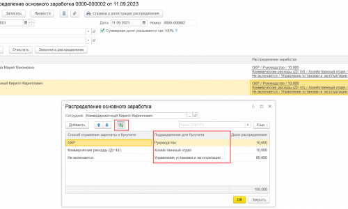 К подразделению «Участок» относятся сотрудники общие для «Котельная 1» и «Котельная 2». Например, водители и уборщица. Нужно ЗП по подразделению «Участок» распределить на «Котельную 1» и «Котельную2».