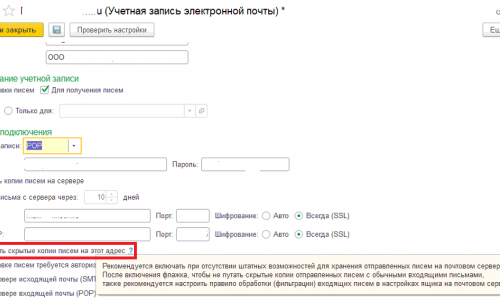 Флажок «Отправлять скрытые копии писем на этот адрес» работает только для типа учетной записи РОР.