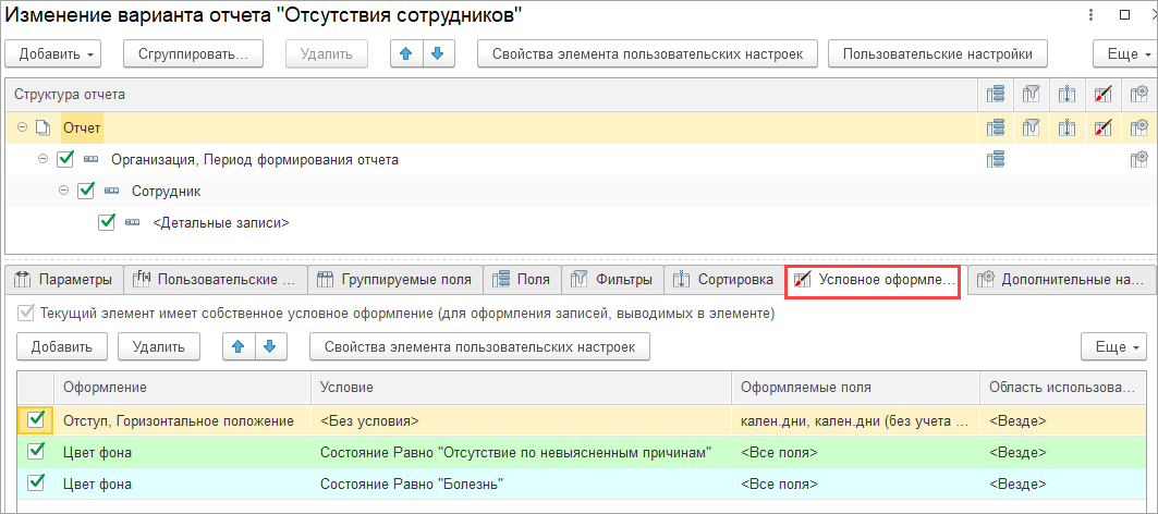 2. Выделить цветом отсутствия по невыясненным причинам и больничный, для этого добавить условное оформление: