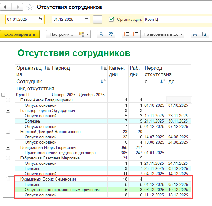 Обнаружили у некоторых сотрудников на совсем правильно внесённые документы отсутствия по невыясненной причине.