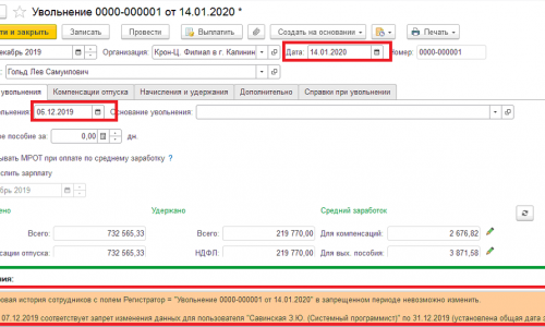 Да, ошибка. У меня ошибка записи в регистр «Кадровая история сотрудников» появляется при любом месяце начисления. Программе нужно сделать запись в регистр 07.12.19, а дата запрета мешает. Бывают случае согласно законодательства, что сотрудника нужно уволить определенным числом, не хотелось бы при это открывать период.
