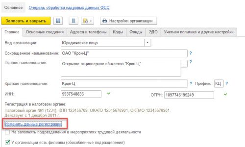 Если реквизитах организации перейти по ссылки Изменить данные регистрации, то будет смена учета по ндфл. Вот как раз удастся разделить учет по отчетам 6 НДФЛ. Благодаря смене регистрации. Но этот вариант выйдет при условии смены ООО на АО с 1 числа месяца, если будет с другой даты, то тоже нужно «играть » с документами.