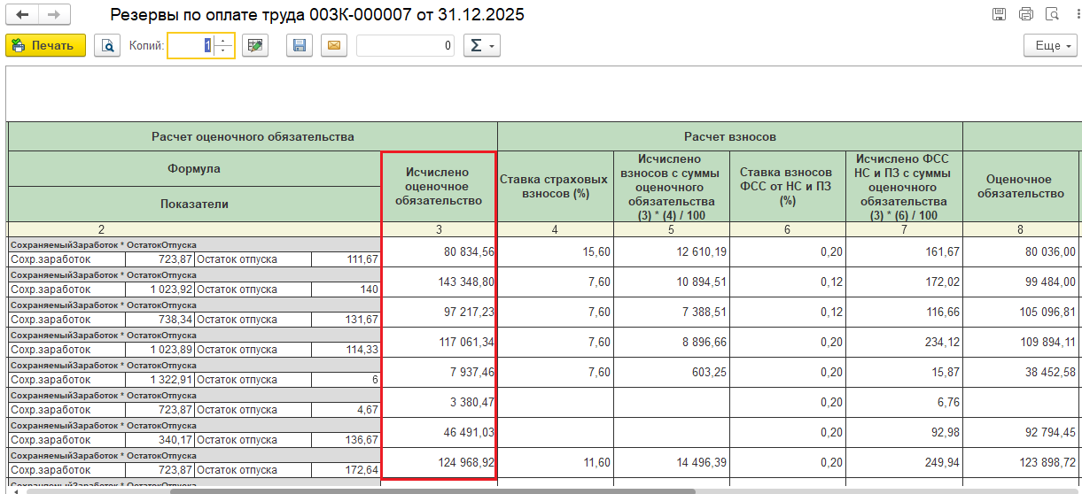 Здравствуйте! По требованиям наших аудиторов нам нужно пересчитать страховые взносы с оценочного обязательства по резерву отпусков на 31.12.2025 г по ставке 30% ( у нас общий тариф СВ). Понимаю,что это делается документом Инвентаризация но не пойму какие там столбцы заполнять и как считать разницу между страховыми взносами, исчисленными 1с по эффективной ставке и моим расчетом по ставке 30%?