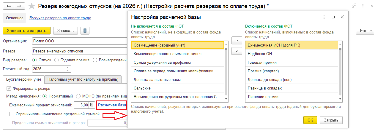 Добрый день! Недавно в программе была ошибка, что при добавлении нового начисления в базу, оно автоматически добавлялось в расчетную базу резерва. Поэтому для исправления ошибки необходимо зайти в раздел Настройка — Организации — карточка организации — закладка Учетная политика и другие настройки — Резервы по оплате труда проверить расчетную базу на 2026 год и исключить из неё лишние начисления: