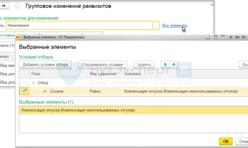 2) в поле «Изменять» выбрать «Начисления», перейти по ссылке «Все элементы» и настроить Отбор : «Ссылка» «равно» выбрать ту доплату, которую нужно исключить из среднего заработка;