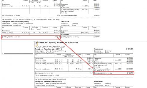 В январе сотруднику переплатили аванс. Возникло сальдо на конец с минусом (сумма -6721). А в феврале сальдо на начало уже другое (-573). На эту сумму уменьшается аванс при выплате в феврале. Почему так происходит? Анализ ЗП за первую половину во вложении