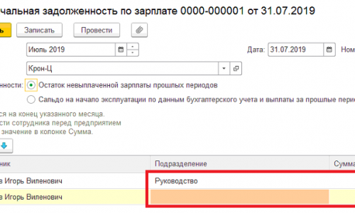 Добрый день! В ведомости эти суммы должны «схлопнутся» автоматически. Но можно исправить, если ввести документ «Начальная задолженность по зарплате» (раздел Главное — Данные начало эксплуатации) +63 162 по подразделению Охрана и -63 162 без подразделения.