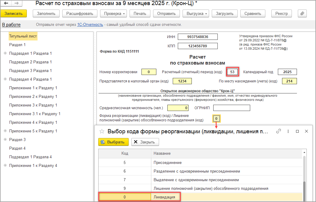 Добрый день! Подали заявления на ликвидацию в упрощенном порядке. Налоговой принято решение о ликвидации, в егрюл это отражено. Так как заявление подали в конце июля, когда надо сдавать отчетность ? И как в формах РСВ, 6-НДФЛ, ЕФС и балансе поставить код при ликвидации? Пробовали в ручную поставить на РСВ код — 53- программа не дает