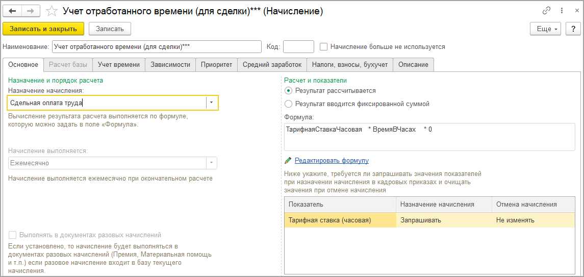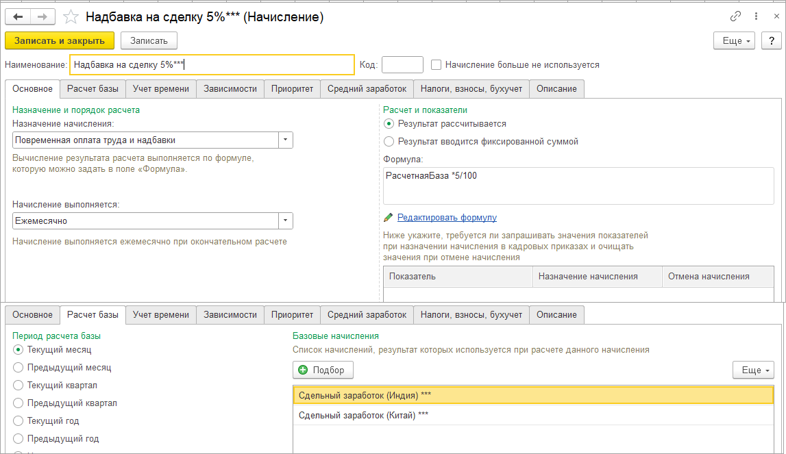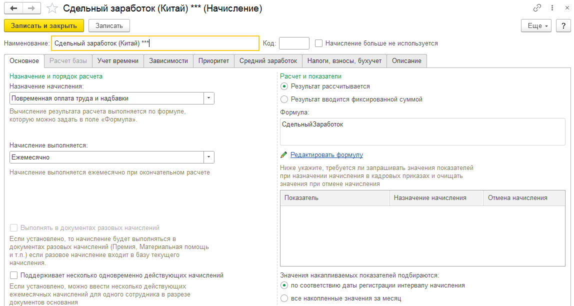 2. Создаем несколько начислений для оплаты сдельного заработка (отдельно для России, Индии, Китая и др.), которое будет выглядеть, как доплата и не учитывать время, например: