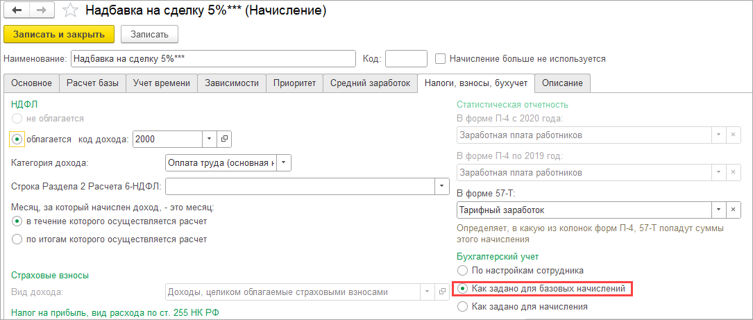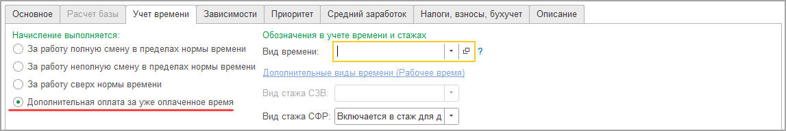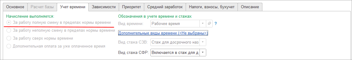 У нас основное начисление Сдельный заработок может быть только одно, т.к. оно определяет отработанное время сотрудника. За это отвечает настройка на вкладке учет времени «За работу полную смену в пределах нормы времени».