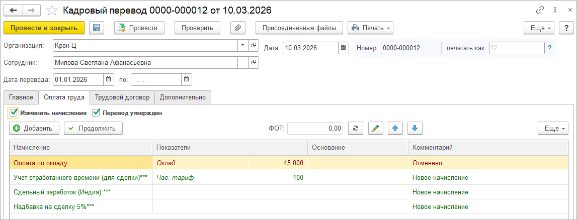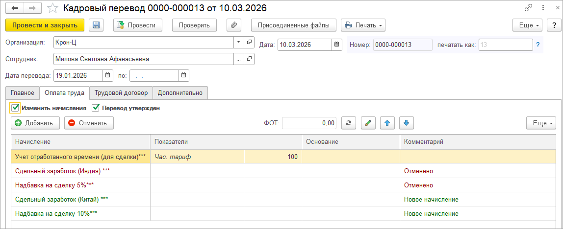 4. При переводе сотрудников с одной сдельной работы на другую оформляем перевод, в котором меняем начисления, например: