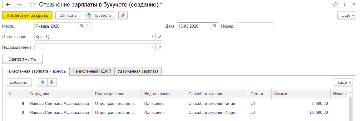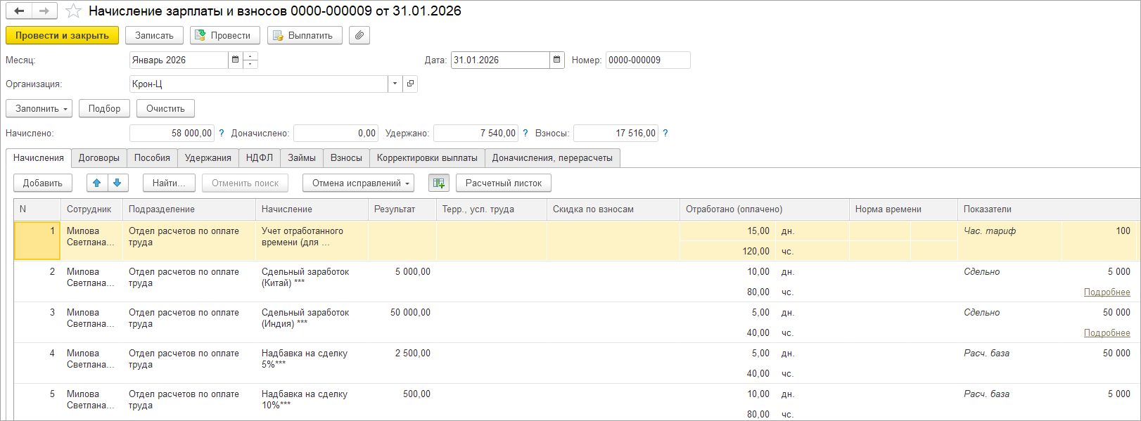 Смоделировала в демо-базе ЗУП настройку начислений и расчет: