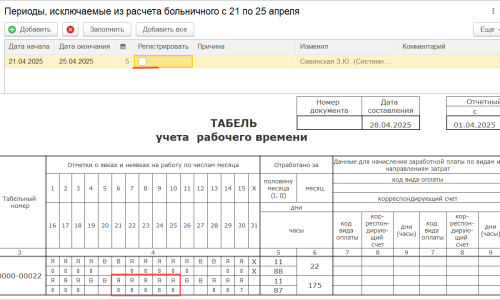 В бл на закладке Оплата добавила 14.04 как работа без флага регистрировать, в табеле все ок, но в ответе оплата за счет СФР с 17.04 по 24.04 и в табличной части не проставляется 14.04 как раб день.