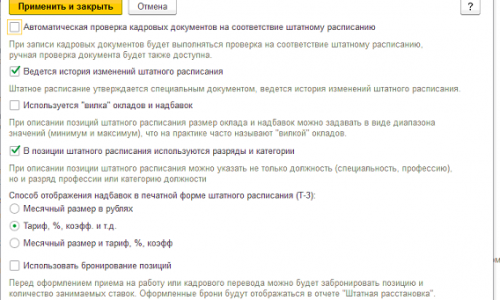 По первому пункту, достаточно установить галочку Ведется штатное расписание в разделе Настройка — Кадровый учет — Настройка штатного расписания. Только Вам нужно выбрать вариант ведения штатного расписания с историей или без. В последнем случае нужно будет вводить документы по утверждению и изменению штатного расписания. Подробно варианты рассмотрены в публикации — Варианты ведения штатного расписания в программе, настройки штатного расписания .