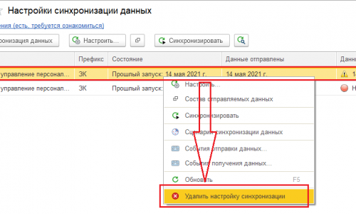 Здравствуйте! Т.е. если в разделе Администрирование — Синхронизация данных — Настройки синхронизации правой кнопкой мыши нажать «Удалить настройку синхронизации» она не удаляется?