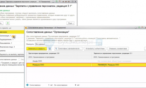 На последнем этапе появится окно сопоставления данных, в нём как раз и нужно будет сопоставить организации и другие элементы: