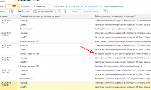 Вы опять прислали список журнала регистраций, а я прошу, чтобы Вы нажали двойным щелчком на строчку, где описана ошибка, чтобы открылось отдельное окно. В нем будет виден полный текст ошибки, в таком списке, который Вы прислали, полный текст ошибки не виден. Интересует строчка, где написано «Не удалось подключиться к другой программе»