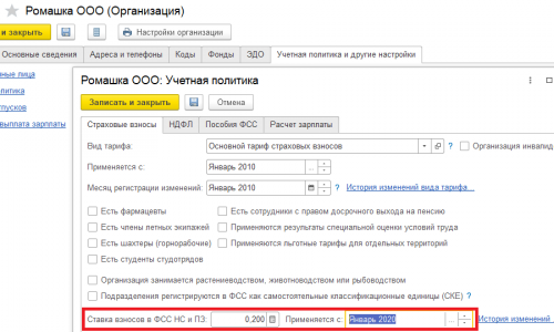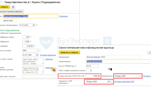 Если использовать механизм СКЕ, то в настройках подразделения необходимо указать верную ставку и период начала применения «Январь 2020». Пример на скриншоте. Подробнее про настройку СКЕ в программе — СКЕ для взносов ФСС НС и ПЗ (ЗУП 3.1.13) .