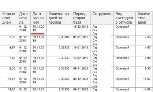Если обратить внимание на самую первую строку в приложенном файле, то у нас пошло расхождение в периоде рабочего года. В новой базе период заканчивается 30.11.2019. Если сотрудница была принята 1 декабря 2017, то расчетный год будет именно по 30 ноября.