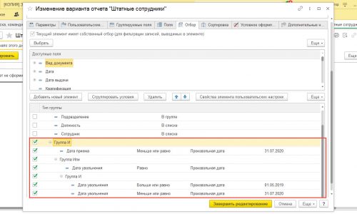Получается нас интересуют сотрудники у которых «Дата приема» <= 31.07.2020 И при этом либо "Дата увольнения" = 0 (то есть они до сих пор работают) ИЛИ они уже уволены, но увольнение произошло в промежуток с 01.05.19 по 31.07.20. Если так, то можно сформировать отчет "Штатные сотрудники" вот с таким условием: "Дата приема" <= 31.07.2020 И ("Дата увольнения" = 0 ИЛИ ("Дата увольнения" >=01.05.2019 И «Дата увольнения» <= 31.07.2020 )) Условие надо написать в настройках отчета (Еще - Прочее - Изменить вариант отчета), открыть вкладку "Отбор". Там убрать отбор "Работающие сотрудники" и написать то условие, которое я описал. Скрин оформленного условия приложил