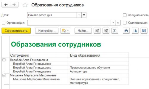 Выслала Вам на почту настройки отчета с отбором по виду образования — Высшее образование и сортировкой сотрудников по Табельному номеру.