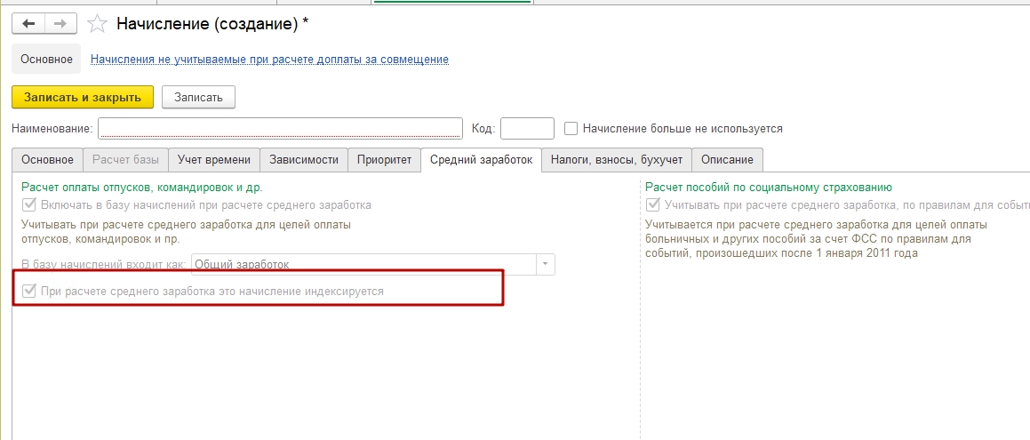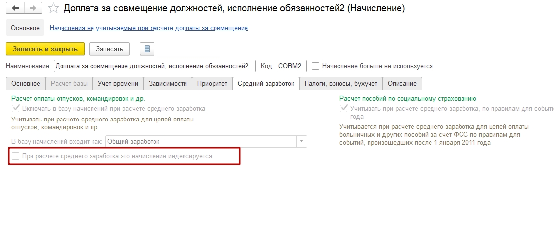 Добрый день , как в ЗУП создать второй вид начисления за совмещение. ? Один вид уже у нас есть , там стоит галочка индексировать при расчете среднего заработка. Нам нужно второе начисление без галочки индексировать . Программа при создании второго начисления закладку средний заработок делает не активной.