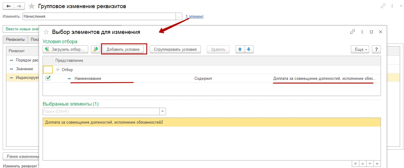 В окне Изменять выберите Начисление и то начисление (укажите точное наименование изменяемого начисления), которое нужно изменить.