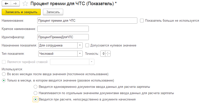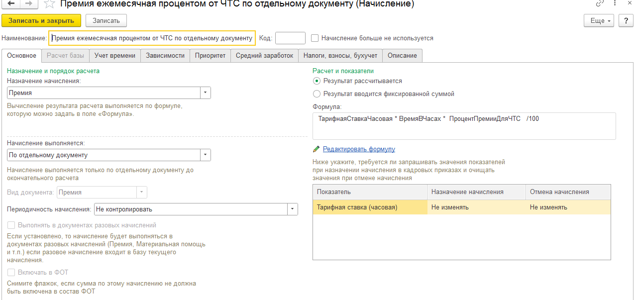 В организации создана премия, которая начисляется по отдельному документу и зависит от оклада (для сотрудников окладников). Формула данной премии состоит так: Оклад*Процент Премии/100*Время в Днях Часах/Норма дней.