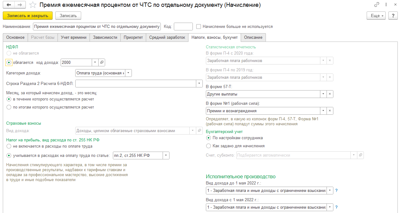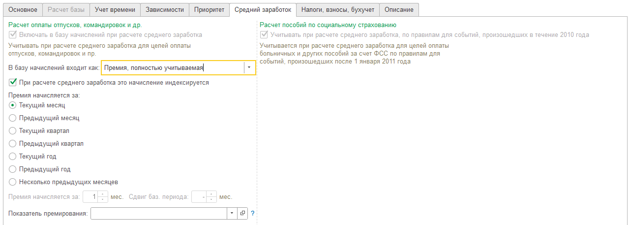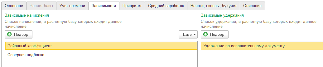 На вкладке Зависимости будут подобраны начисления и удержания в расчетную базу которых попадает данная премия (у Вас здесь могут быть другие начисления и удержания)