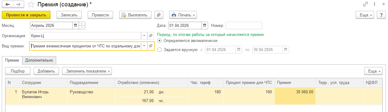 Документ премия нужно создавать после того, как в базе отражены все неявки по сотрудникам, чтобы правильно учитывались отработанные часы