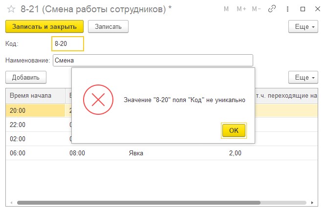 Здравствуйте! Протестировала ситуацию на последнем релизе и на более старом (прошлогоднем) — отрабатывает абсолютно одинаково, а именно не дает создать смену с одинаковым кодом, происходит проверка кода на уникальность. Вижу,что у Вас в справочнике есть такие смены, но на данный момент у меня получилось добиться такой картины только с помощью группового изменения реквизитов. Кстати, также как у Вас такие смены потом можно перезаписать без ошибки. Но если потом поменять код и снова попытаться вернуть неуникальный, программа не дает это сделать.