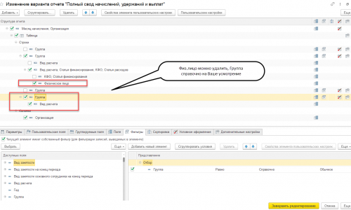 Встаем на уровень группы- Вкладка фильтры. Ставим флажок Удержано. Вид расчета ставим не равно, выбираем Вид особых начислений и удержаний и там укажем НДФЛ. Тем самым не будет отображаться НДФЛ. Если надо несколько, выбираете не в списке и перечисление.