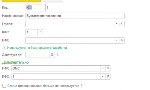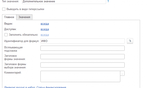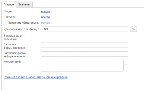 1. Администрирование — Общие настройки — Дополнительные реквизиты и сведения — Взводим флажок Дополнительные реквизиты и сведения и открываем ссылку Дополнительные реквизиты. Находим папку «Статьи финансирования» — нажимаем Добавить и создаем реквизит. Один для ИФО, второй для КФО. При создании на главной вкладки укажем только имя. На значении пропишем все варианты, которые у Вас есть.