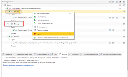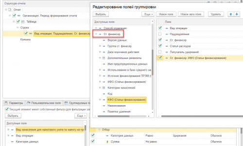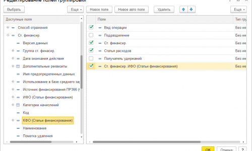 Теперь настроим строки в оставшейся таблице. Два раза щелкаем по выделенной строчке. В редактирование полей группировки убираем не нужные поля и добавляем только что созданные. Ищем в перечнь доступных полей Ст. финансирования, раскрываем ее и два раза щелкаем по ИФО и КФО. Так что бы они попали в блок полей справа.