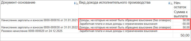 — Заработная плата и иные доходы с ограничением взыскания — 50руб.