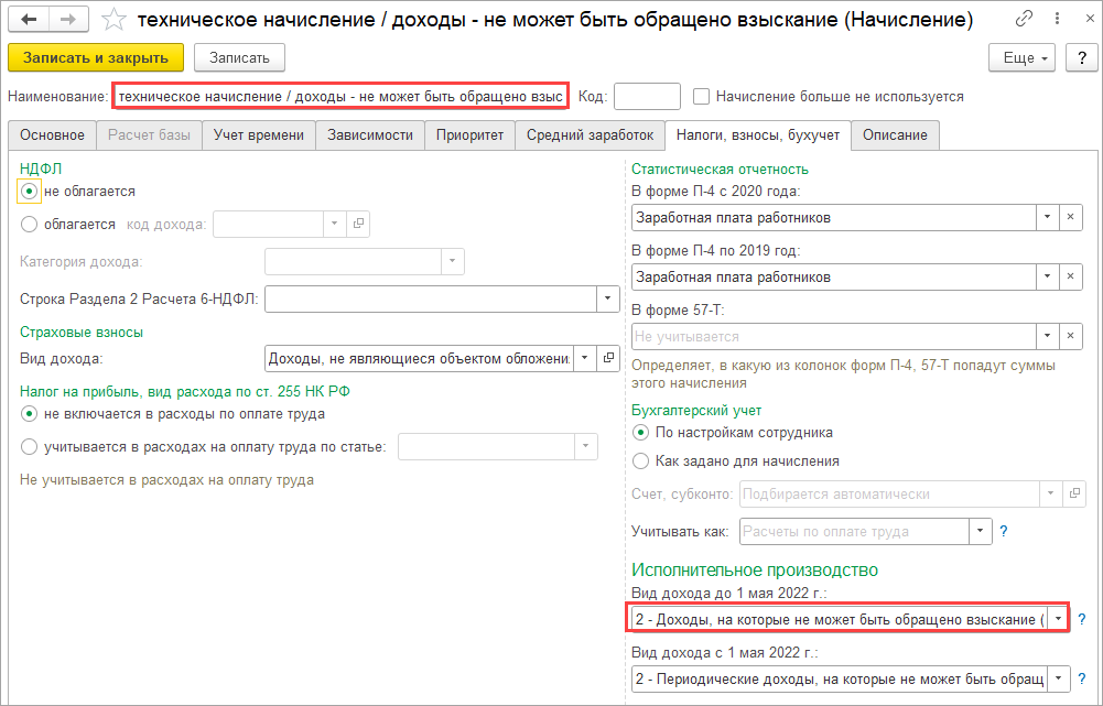 1. Настроим техническое разовое начисление ( Доходы на которые не может быть обращено взыскание), например: