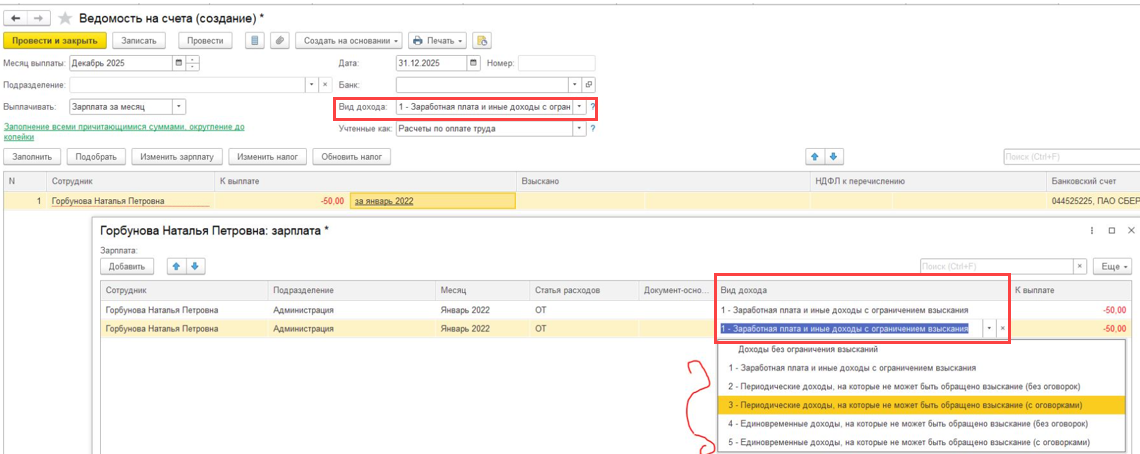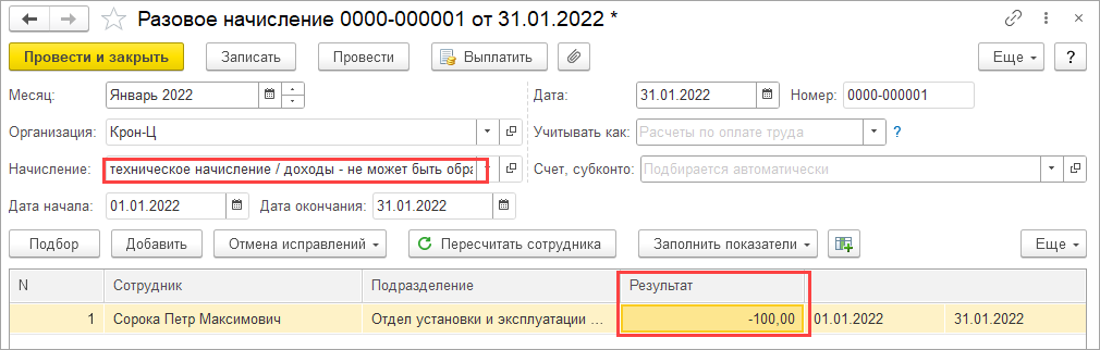 После введения разового начисления на сумму с -50 руб. в расчетном листке сумма задолженности =0. Но смущает, что в ведомости (при подборе сотрудника)теперь появляется не -50, а -100.