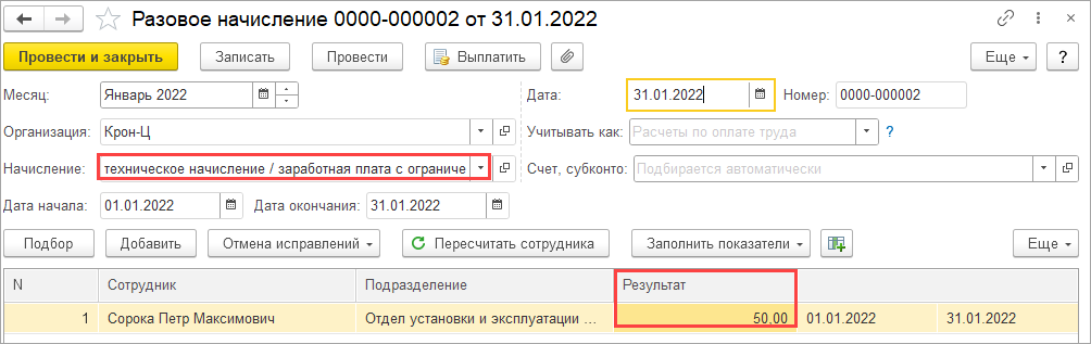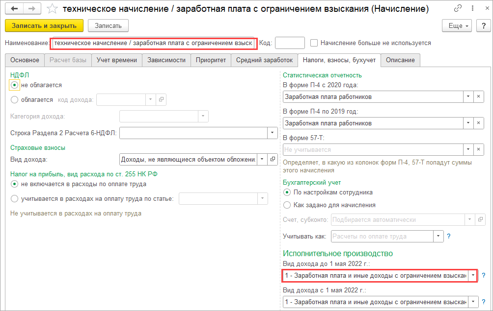 2. Настроим техническое разовое начисление (Заработная плата и иные доходы с ограничением взыскания), например:
