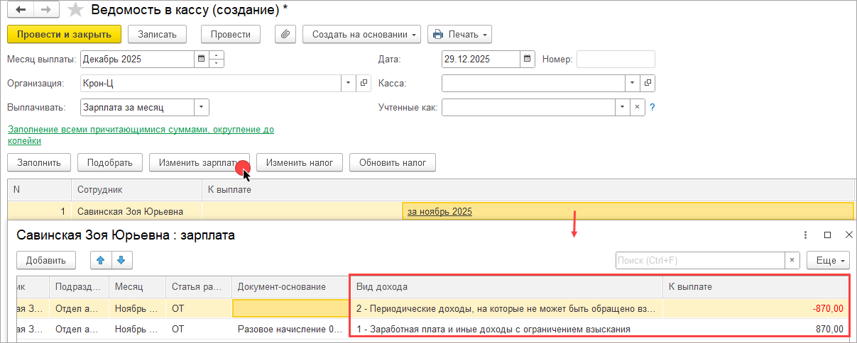 Чтобы закрыть такую пересортицу можно создать «техническую» ведомость на выплату в кассу, подбором добавить сотрудника в нее, в результате подтягиваются все виды исполнительного производства. В итоге сумма к выплате будет 0, но если открыть расшифровку суммы к выплате (по кнопке Изменить зарплату), то видим, что закроется пересортица. Например: