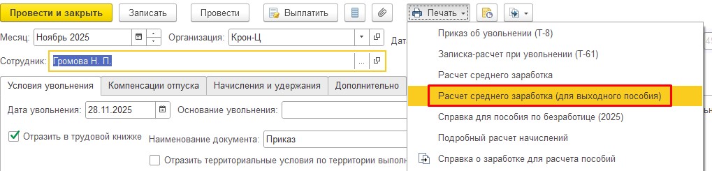 Здравствуйте!Для анализа пришлите пожалуйста скриншот печатной формы Расчет среднего заработка для выходного пособия